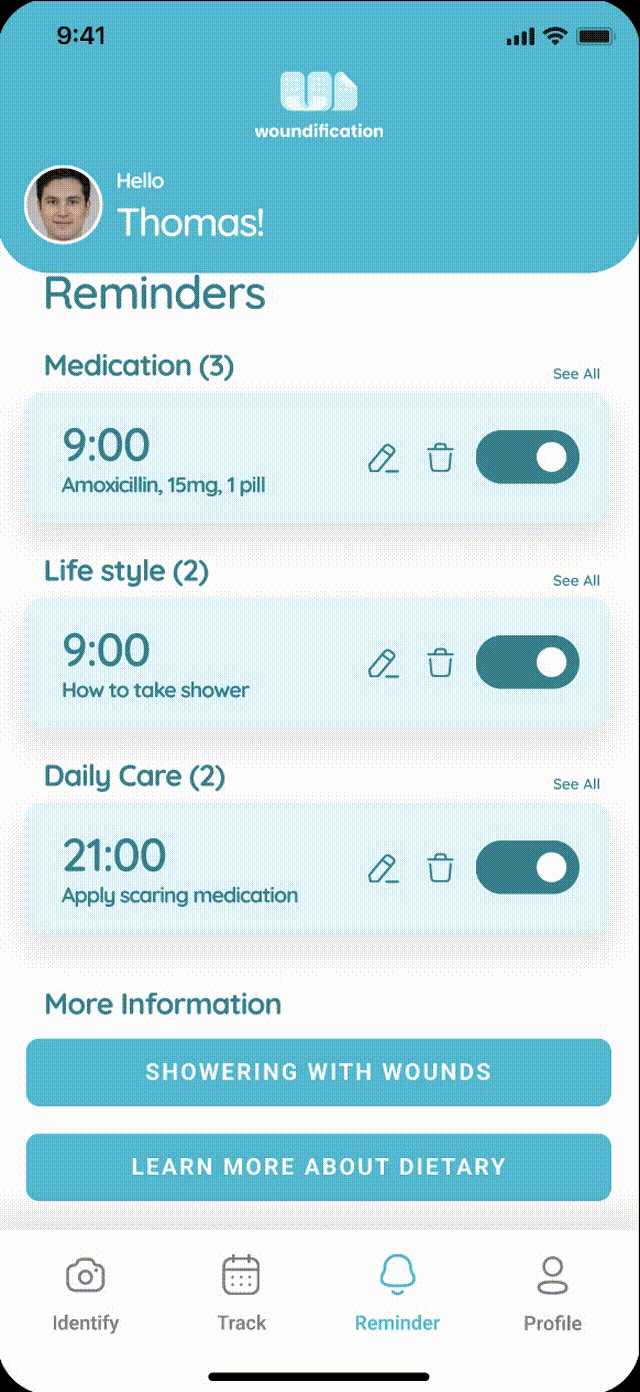We monitor the progress of wound healing and offer appropriate recommendations based on the users’ current state. At the same time, the notification function reminds them to take care of their wound in a timely manner.